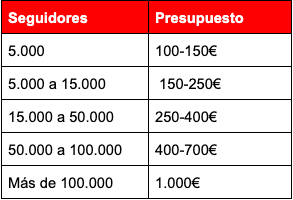 Dependiendo el número de seguidores, el ratio de engagement y el tipo de colaboración el precio variará. A continuación te muestro una tabla de precios aproximados dependiendo el número de seguidores en redes sociales de dichos influencers: